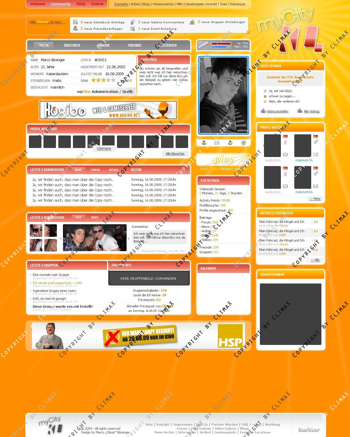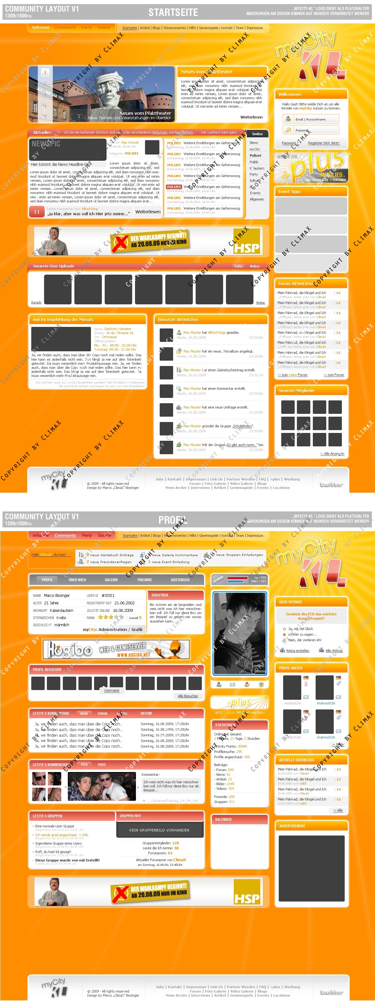 Stelle hier ein Layout für Event / Party Communitys zum Verkauf. Die Startseite sowie die Profilansicht stehen als Unterseiten bereit. Das Design war noch nie Online. Änderungen am Layout können natürlich auf Wunsch gemacht werden. Angeboten wird hier nur die .PSD Datei ohne jegliche Anpassung. Das Logo (myCity KL) dient nur als Platzhalter und ist nicht im Angebot mitenthalten. Bei Fragen stehe ich entweder hier oder in meinem Forum zur Verfügung.