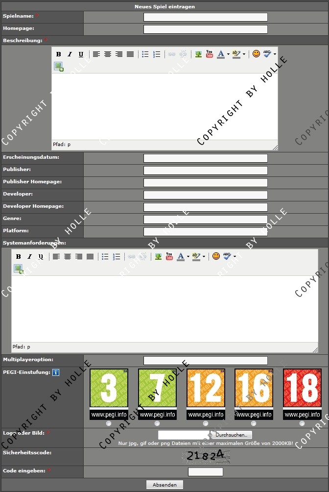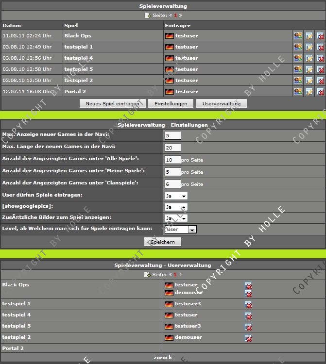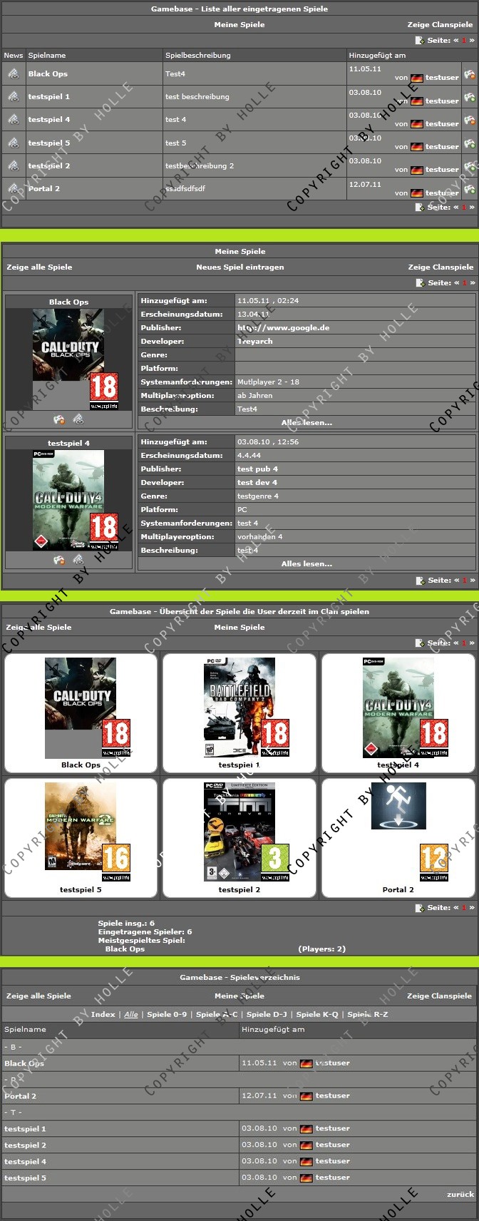 Angelehnt an das System der ESL habe ich hier eine Verwaltung für Spiele im Clan oder in der Community gecode, für die sich Member eintragen können. Zusätzlich können die Member im Clan eigene Spiele einreichen, indem sie ein Formular ausfüllen. (Dieses Feature kann aber vom Admin abgeschaltet werden)